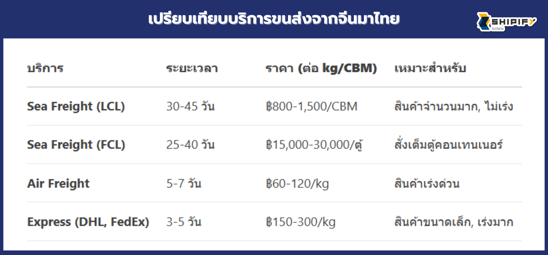 | สั่งมากครั้งเดียว (Sea Freight) | ถูกที่สุด | ช้า (30-45 วัน) |